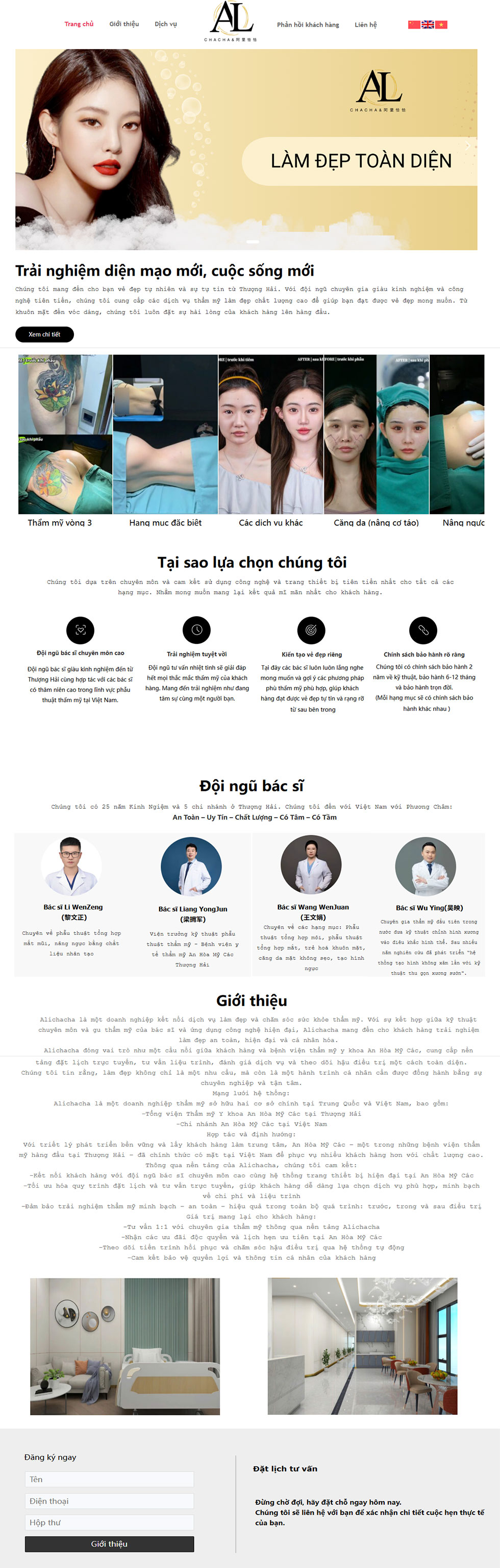 Chúng tôi mang đến cho bạn vẻ đẹp tự nhiên và sự tự tin từ Thượng Hải. Với đội ngũ chuyên gia giàu kinh nghiệm và công nghệ tiên tiến, chúng tôi cung cấp các dịch vụ thẩm mỹ làm đẹp chất lượng cao để giúp bạn đạt được vẻ đẹp mong muốn. Từ khuôn mặt đến vóc dáng, chúng tôi luôn đặt sự hài lòng của khách hàng lên hàng đầu.